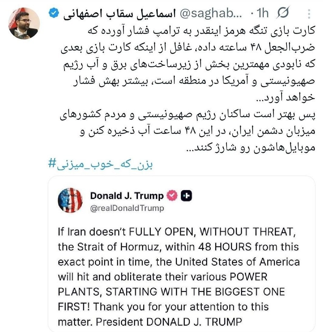 اقتصادنیوز: اسماعیل سقاب اصفهانی نوشت: بهتر است ساکنان رژیم صهیونیستی و مردم کشورهای میزبان دشمن ایران در این 48 ساعت آب ذخیره کنند و موبایل هایشان را شارژ کنند.